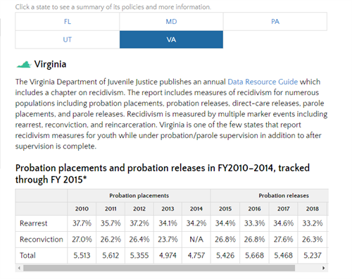 The Juvenile Justice GPS team has updated the popular juvenile recidivism reporting topic, which profiles state reporting of juvenile justice recidivism measures by population type, reoffense events, and demographic details available in the state reports.  Links to the underlying reports are available by selecting a state name.