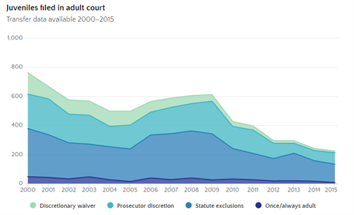 State reported data about transfer to criminal court trends have been updated for Arizona.  Twenty-seven states report ongoing transfer trend data and Arizona is among six states that distinguish the number of transfers by different provisions such as prosecutor discretion and statute exclusions.
