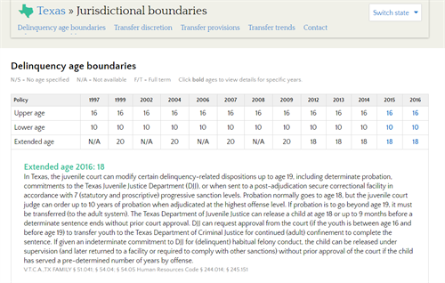 Explore the upper age of delinquency jurisdiction and contrast it to lower ages and extended ages of jurisdiction one place on the Juvenile Justice GPS, Delinquency Age Boundaries map and drill into state details like these for Texas.