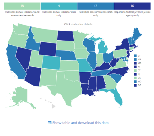 The Juvenile Justice GPS has updated the reported data topic of the racial and ethnic fairness section. This update summarizes publicly available racial and ethnic fairness indicator data reported by states.  Currently, twenty-two states report annual indictor data in agency publications or interactive data dashboards.